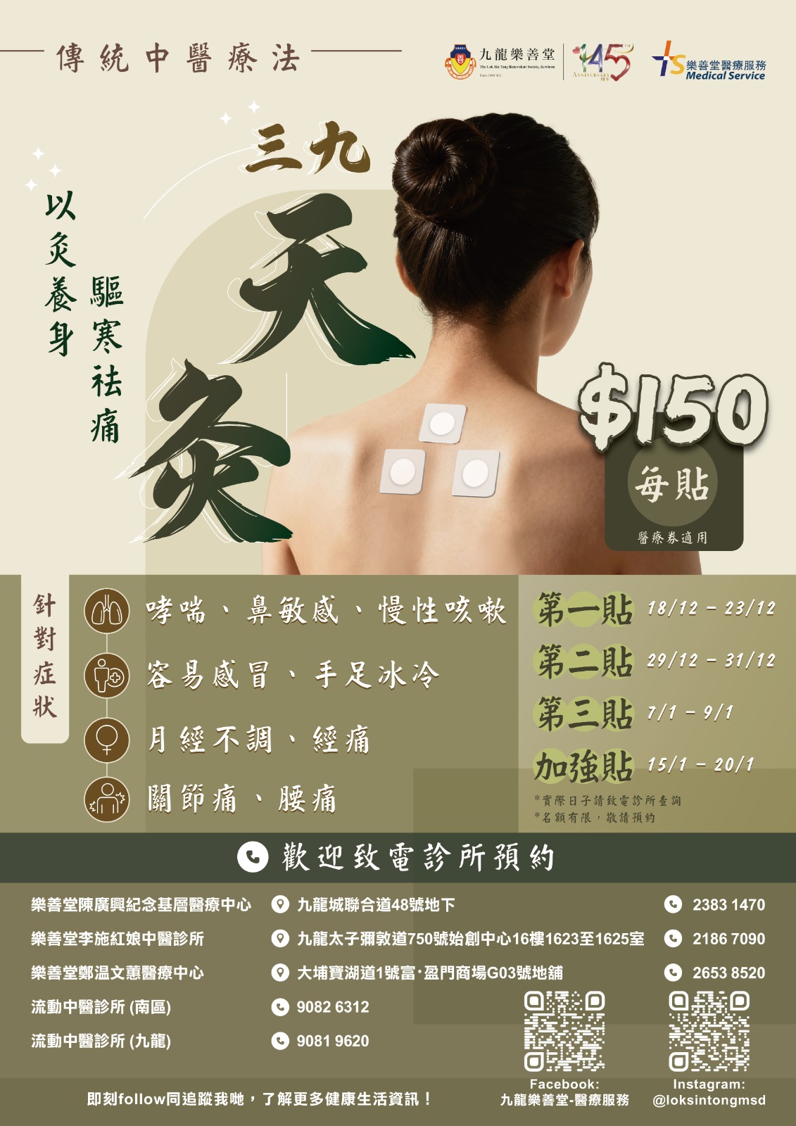 「天灸療法」是一種中醫傳統治療方法,於特定日子,使用藥性辛溫的中藥,再配上薑汁製成藥貼,敷貼於特定穴位上,透過藥物的刺激及吸收,以行氣活血、疏通陽氣、調節臟腑功能,從而達致防病治病的作用。