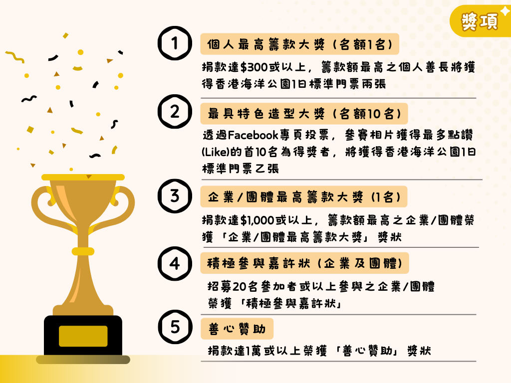 活動設有多個獎項,嘉許各界善長共襄善舉。當中承蒙 香港海洋公園 支持,為「個人最高籌款大獎」(1名) 及「最具特色造型大獎」(10名) 得獎者送出「香港海洋公園標準入場門票」!立即邀請身邊親友募捐支持,一同響應慈善同樂!