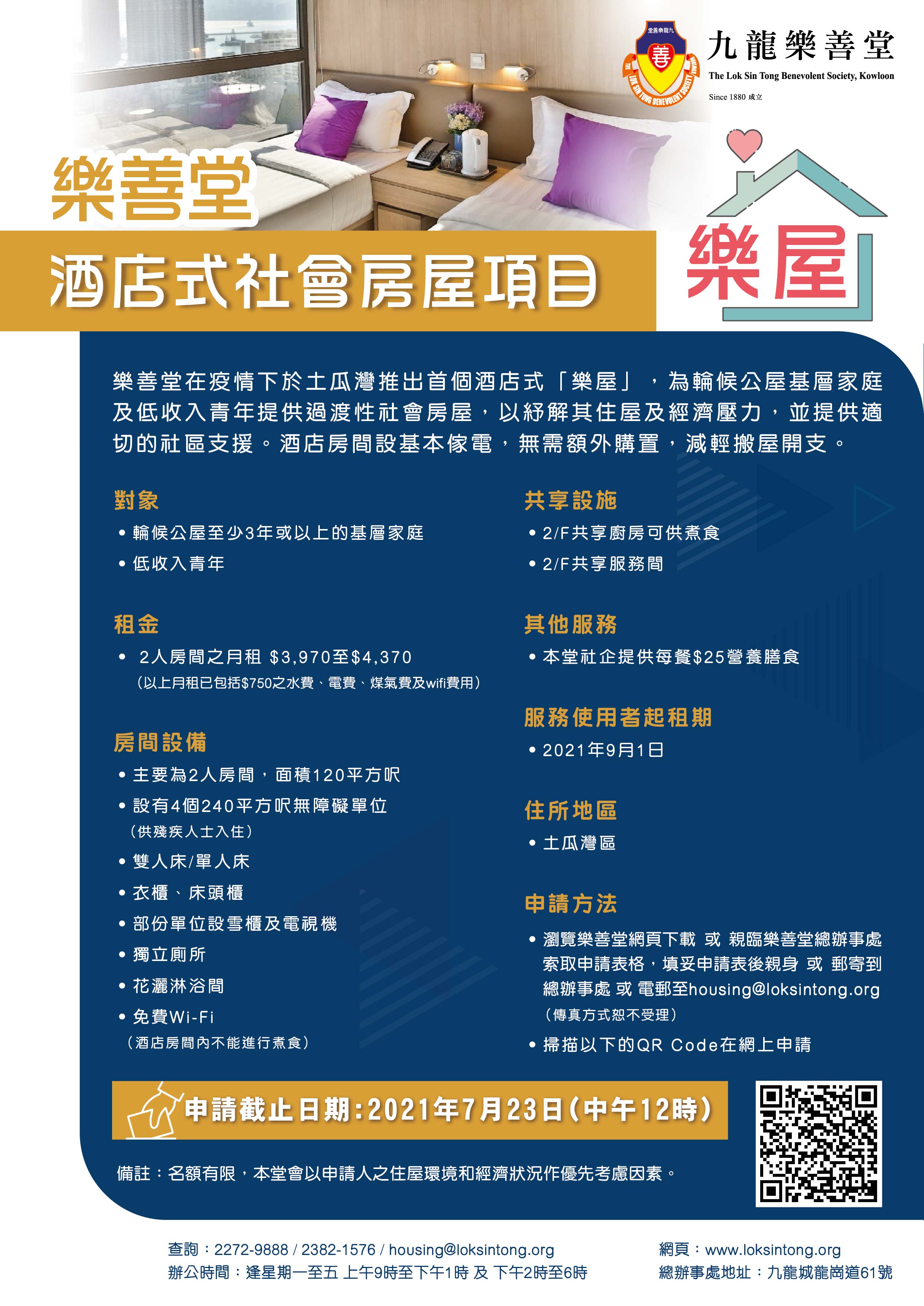 樂善堂在疫情下於土瓜灣推出首個酒店式「樂屋」,為輪候公屋基層家庭及低收入青年提供過渡性社會房屋,以紓解其住屋及經濟壓力,並提供適切的社區支援。酒店房間設基本傢電,無需額外購置,減輕搬屋開支。