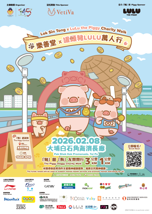 VetiVa呈獻:樂善堂 x 罐頭豬LuLu萬人行為九龍樂善堂145周年旗艦步行籌款活動,將於2026年2月8日(星期日)假大埔白石角海濱長廊舉行。人氣IP「罐頭豬LuLu」將擔任活動大使,與參加者一同踏出愛心步伐,傳揚善心!活動當日更設有「豬」遊派對(慈善嘉年華),於香港科學園高錕會議中心廣場(金蛋)舉行,提供豐富遊戲、攤位及表演,行善同樂!