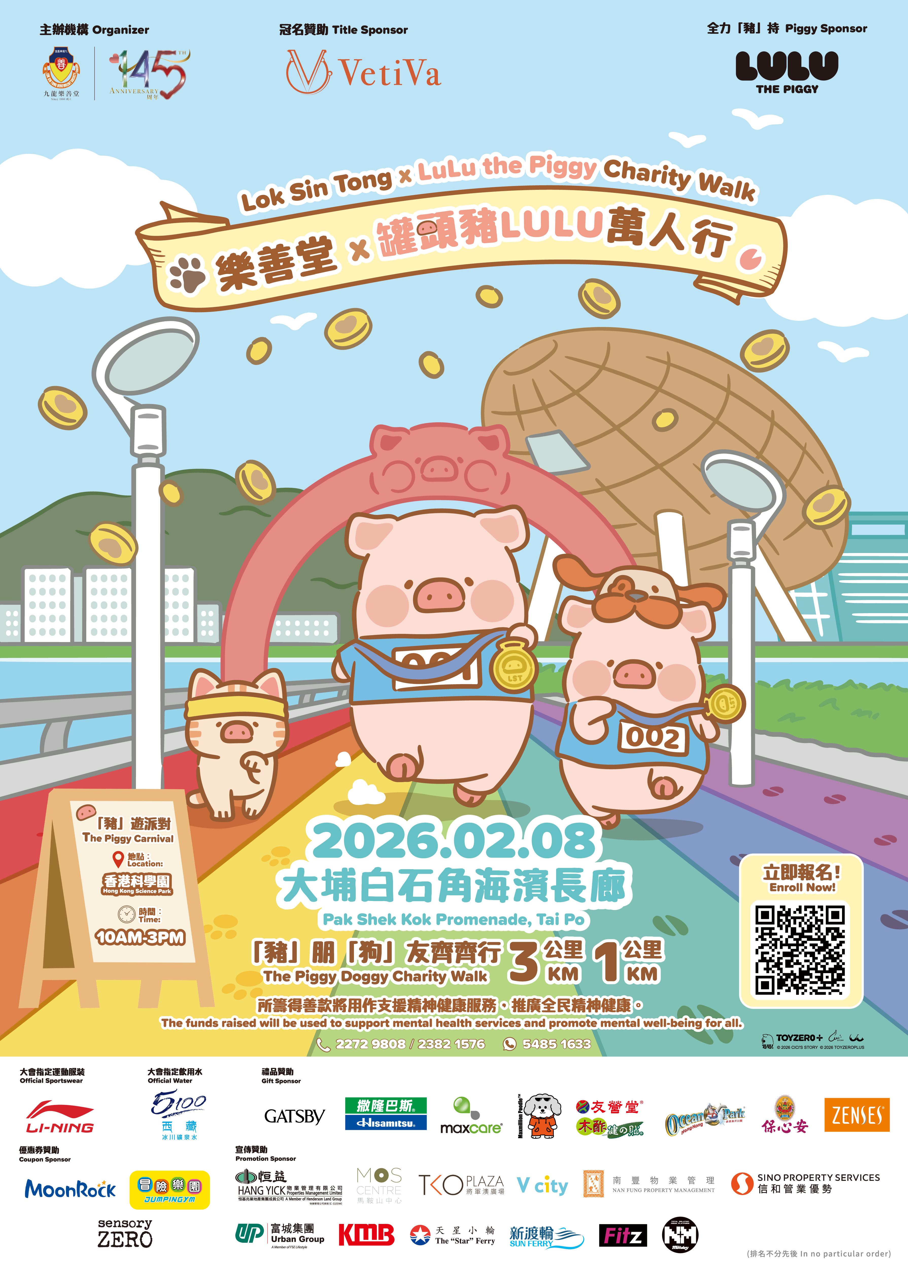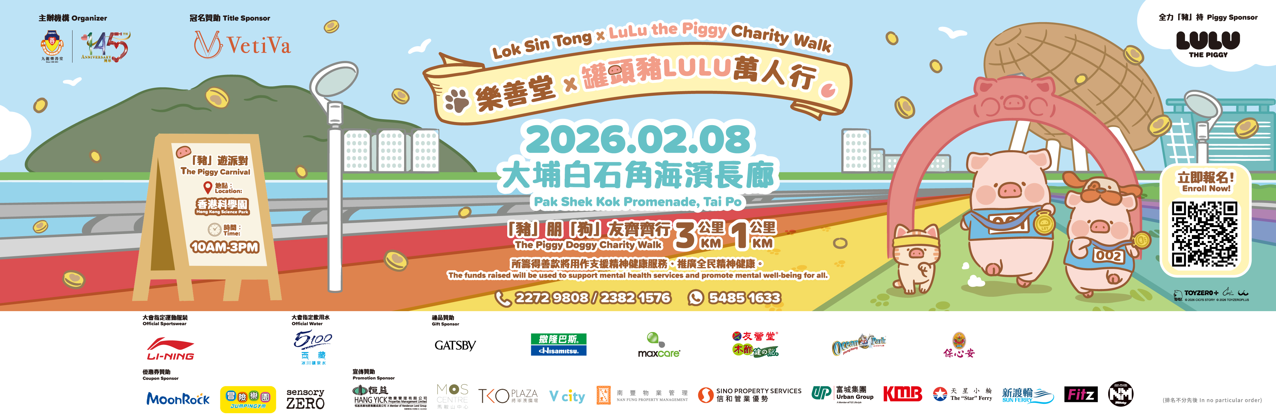 VetiVa呈獻:樂善堂 x 罐頭豬LuLu萬人行為九龍樂善堂145周年旗艦步行籌款活動,將於2026年2月8日(星期日)假大埔白石角海濱長廊舉行。人氣IP「罐頭豬LuLu」將擔任活動大使,與參加者一同踏出愛心步伐,傳揚善心!活動當日更設有「豬」遊派對(慈善嘉年華),於香港科學園高錕會議中心廣場(金蛋)舉行,提供豐富遊戲、攤位及表演,行善同樂!