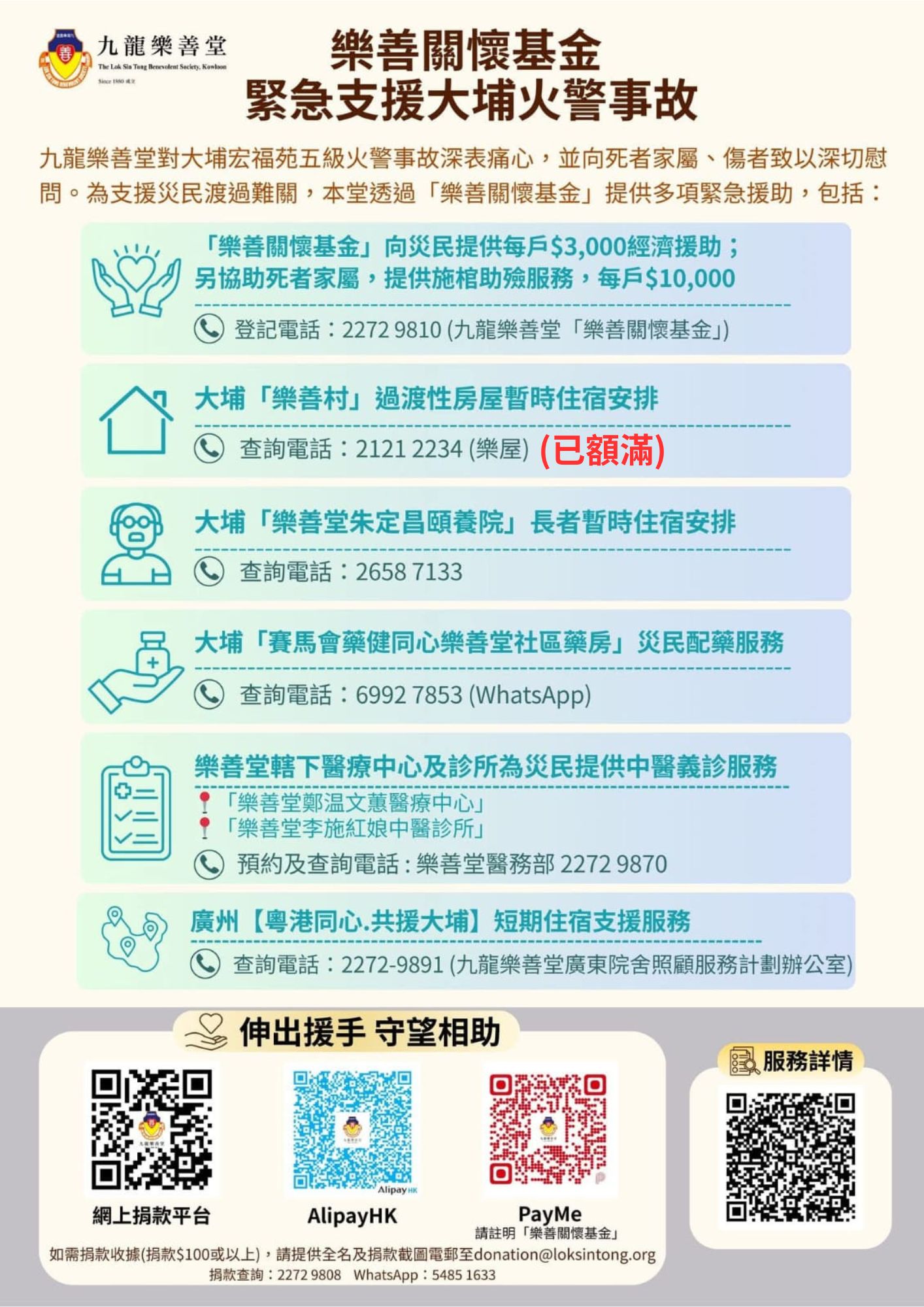 查詢電話:2121 2234 (樂屋) (已額滿) - 本堂啟動「樂善關懷基金」向災民提供每戶港幣3,000元經濟援助;另協助死者家屬,提供施棺助殮服務,每位港幣10,000元