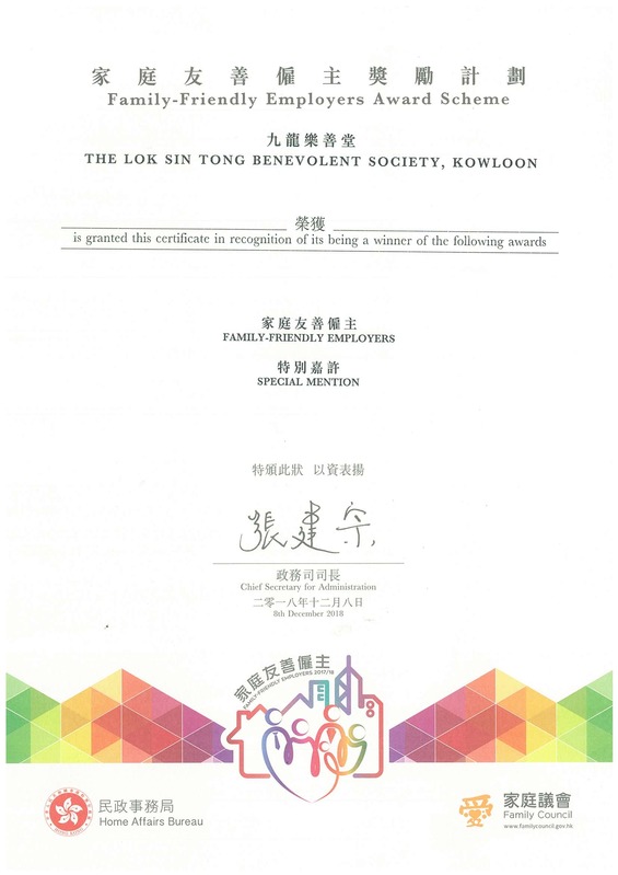 九龍樂善堂獲民政事務局和家庭議會評為「2017/18家庭友善僱主」,同時獲得「特別嘉許獎」,以肯定本堂於家庭友善方面的工作。