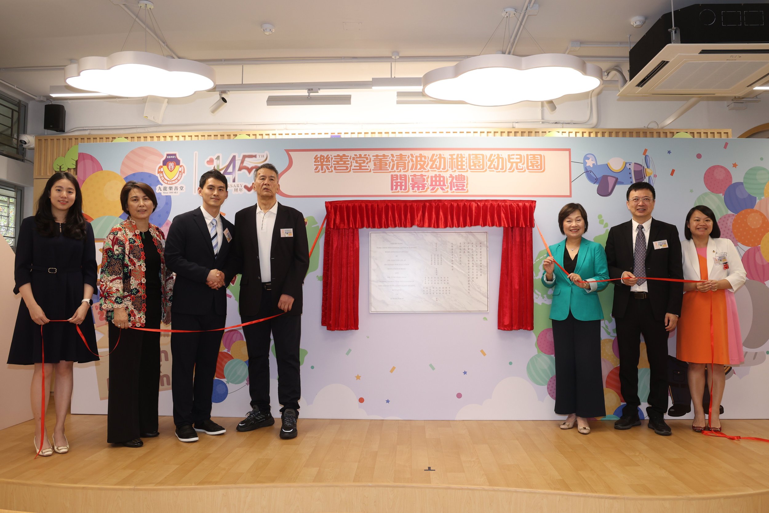 蔡若蓮局長在致辭時表示,九龍樂善堂開辦多所中、小學及幼稚園,致力為幼童及青少年提供優質教育服務,惠澤莘莘學子,為香港社會培養一代又一代棟樑之材。幼稚園作為小童成長的重要階段,同時是奠定其終身學習基礎的關鍵時期。「樂善堂董清波幼稚園幼兒園」通過教育局校舍分配工作,獲分配白田之新建校舍,於2024年9月開辦幼稚園課程,在去年9月成功註冊成幼兒園,開設兩至三歲預備班,讓更多區內家庭獲得全面的幼兒教育及照顧服務,協助區內雙職家長減輕照顧幼兒壓力,讓他們能夠安心投入工作。