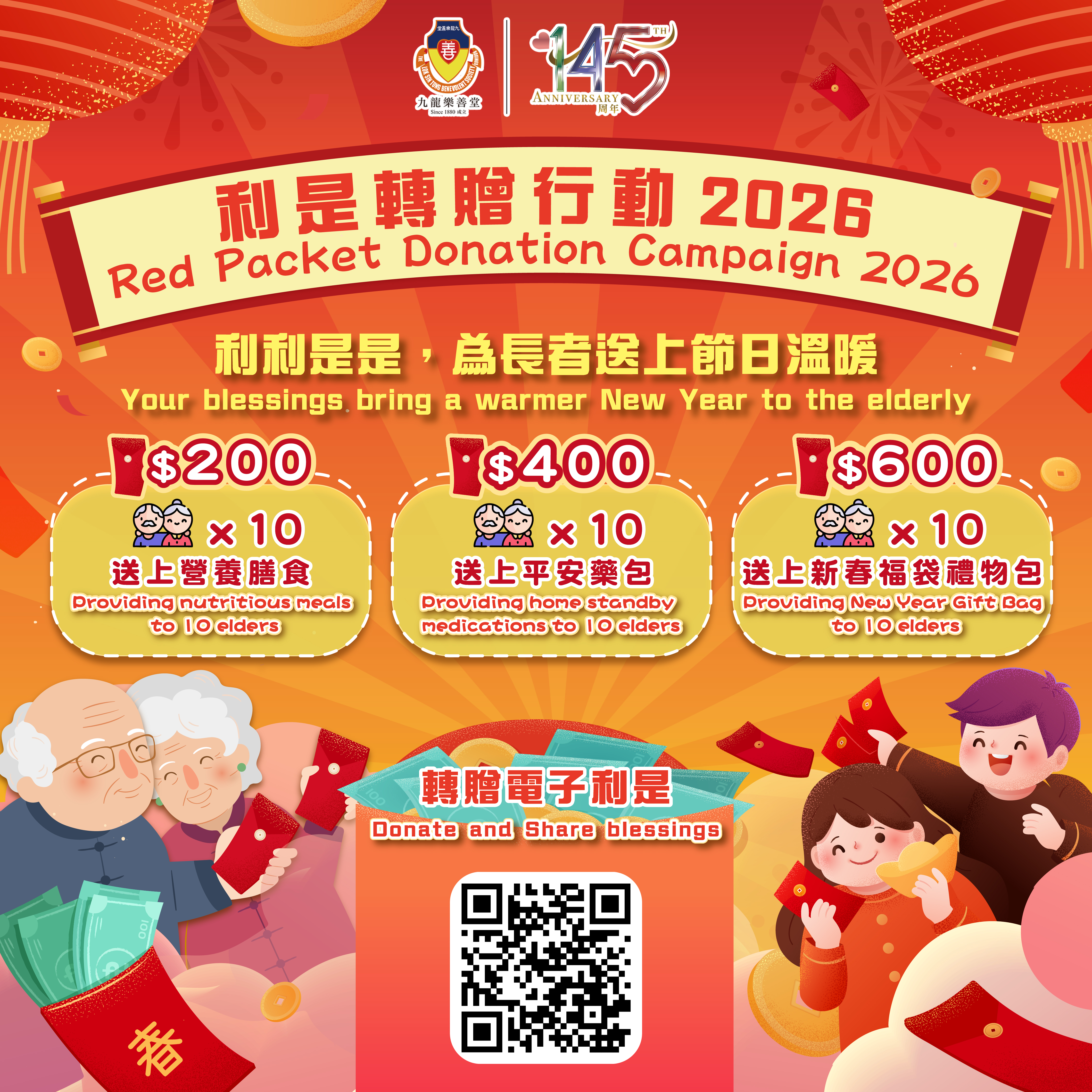 誠邀您捐出善心利是,支援有需要的長者。同時,本堂常務總理會將額外贊助相同金額的利是,並為長者送上節日溫暖禮物。