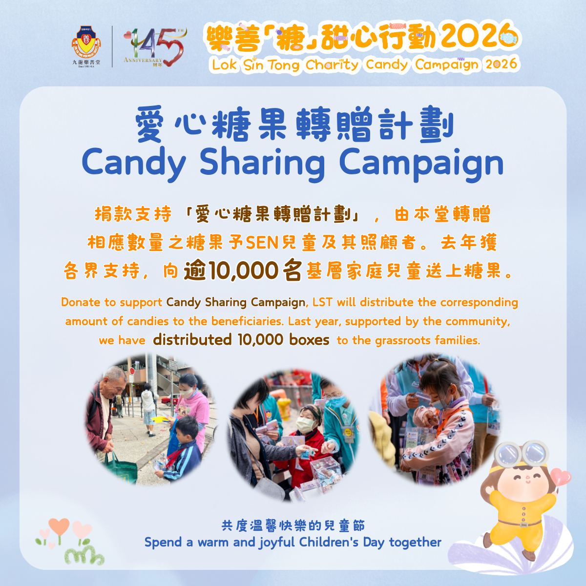 本年度「樂善『糖』甜心行動」將於2026年3月21日至22日於全港指定商場及戶外地點進行糖果義賣。即日起,善長亦可透過網上商店「樂善商店」,捐款支持愛心糖果轉贈計劃,為受助者提供社福支援,讓受助者感受到關懷與價值。是次活動所籌得之善款均用作支援特殊學習需要(SEN)兒童及其照顧者,與他們「童」享一點甜。