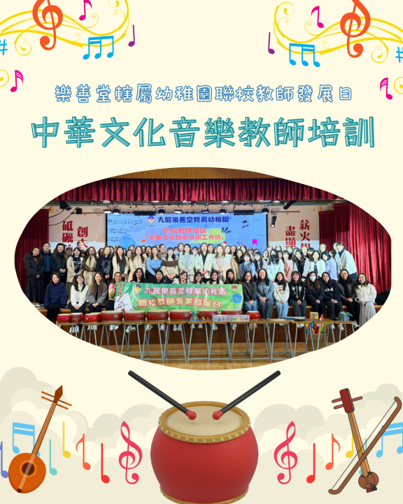 早前樂善堂轄屬幼稚園舉辦了聯校教師發展日,本年度以「中華文化音樂培訓」為主題,內容涵蓋節奏訓練、常見樂器演奏技巧,以及如何將音樂元素融入日常課堂等實用環節。教師們透過工作坊及即場示範,學習如何因應幼兒年齡發展需要,以歌曲帶領不同年級幼兒進行遊戲,從而豐富校本音樂課程。...